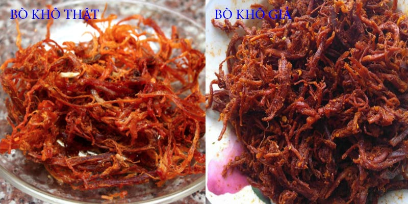 - Khô bò giả: Có hai thái cực. Một là quá mềm và ẩm, có cảm giác hơi nhớt do bị tẩm ướp nhiều đường và các chất giữ ẩm. Hai là quá khô cứng và giòn, bẻ nhẹ là gãy vụn, do được làm từ bột hoặc sấy quá lửa để che giấu mùi.