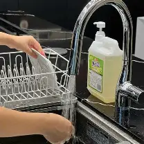 Lấy dung dịch: Nhấn vòi xịt để lấy một lượng vừa đủ (khoảng 2.5ml) trực tiếp lên miếng rửa chén đã thấm nước.